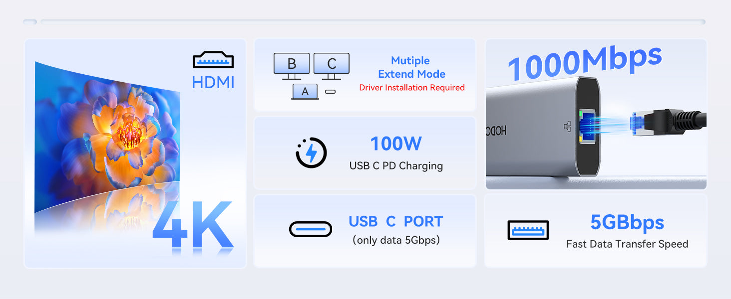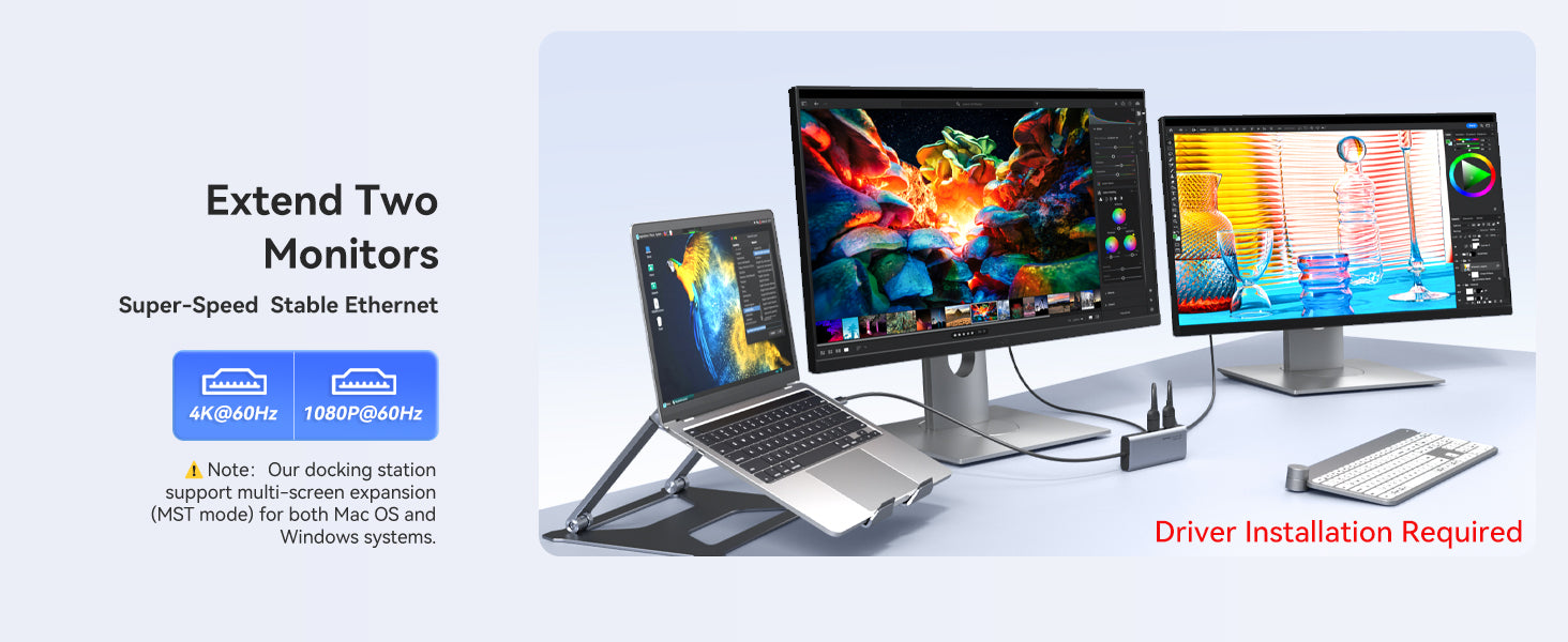 - 【Dockingstation Laptop 2 Monitore HDMI】USB C Dockingstation können Sie Ihren Laptop auf 2 Bildschirme aufteilen. Die Auflösung unterstützt bis zu 4K@30 Hz und 1080P@60 Hz, wenn gleichzeitig zwei HDMI angeschlossen werden. Dieses hub ist für zwei verschiedene Bildschirme sowohl auf Windows- als auch auf MacOs-Computern erweiterbar.