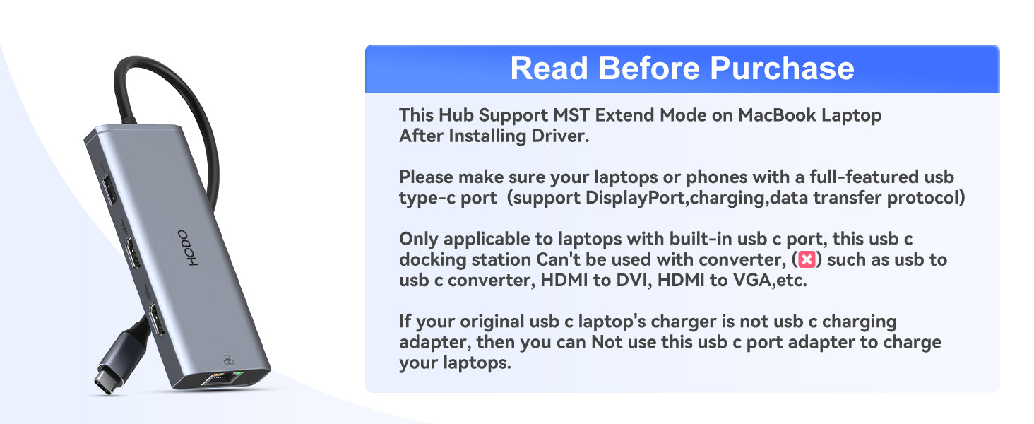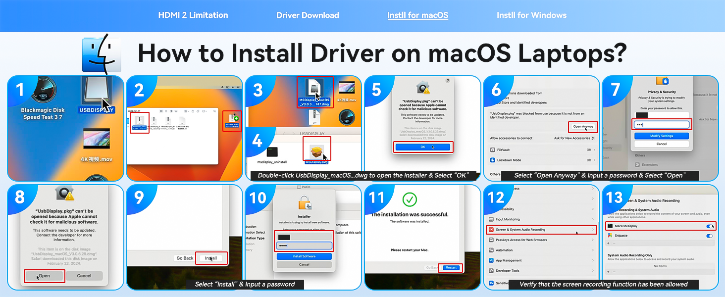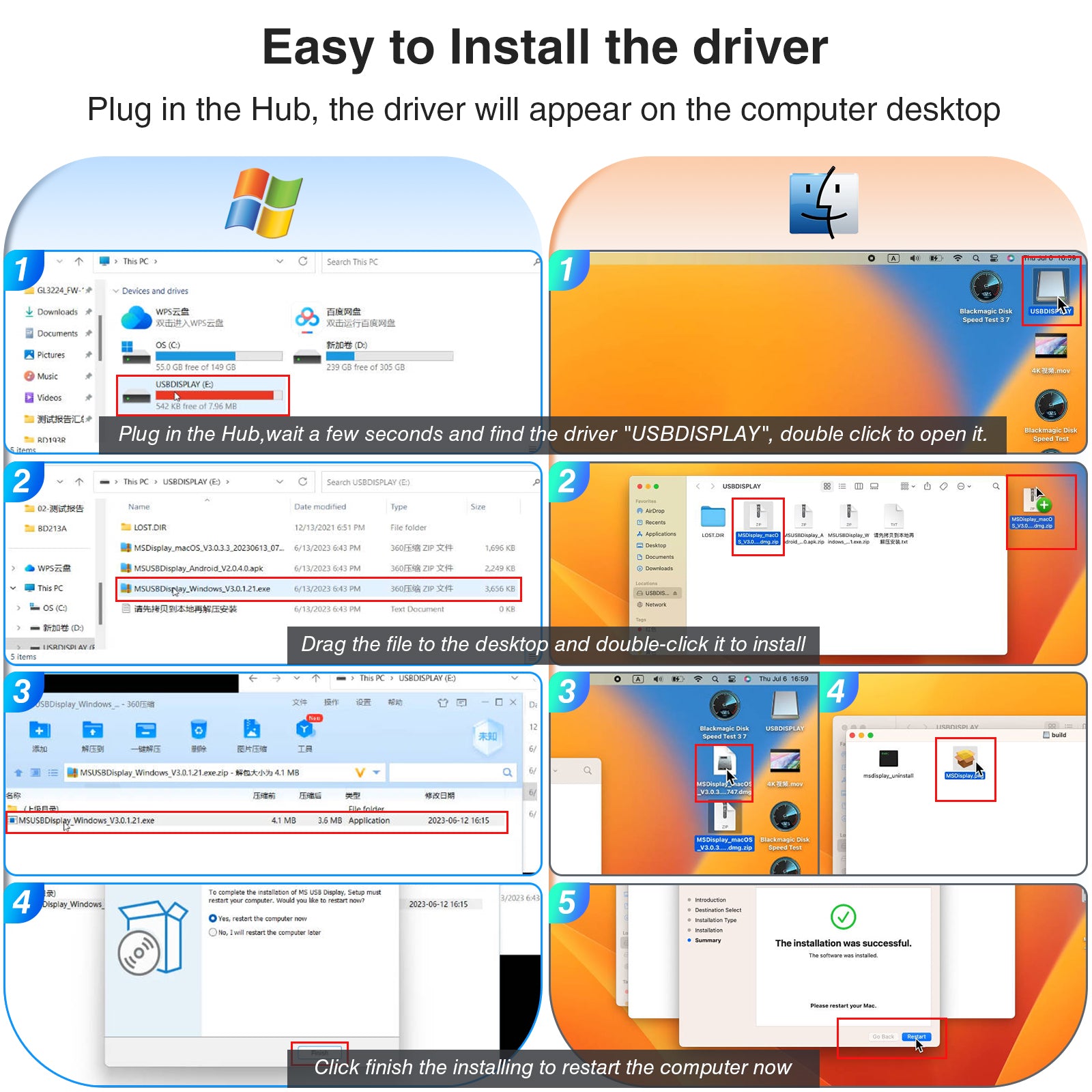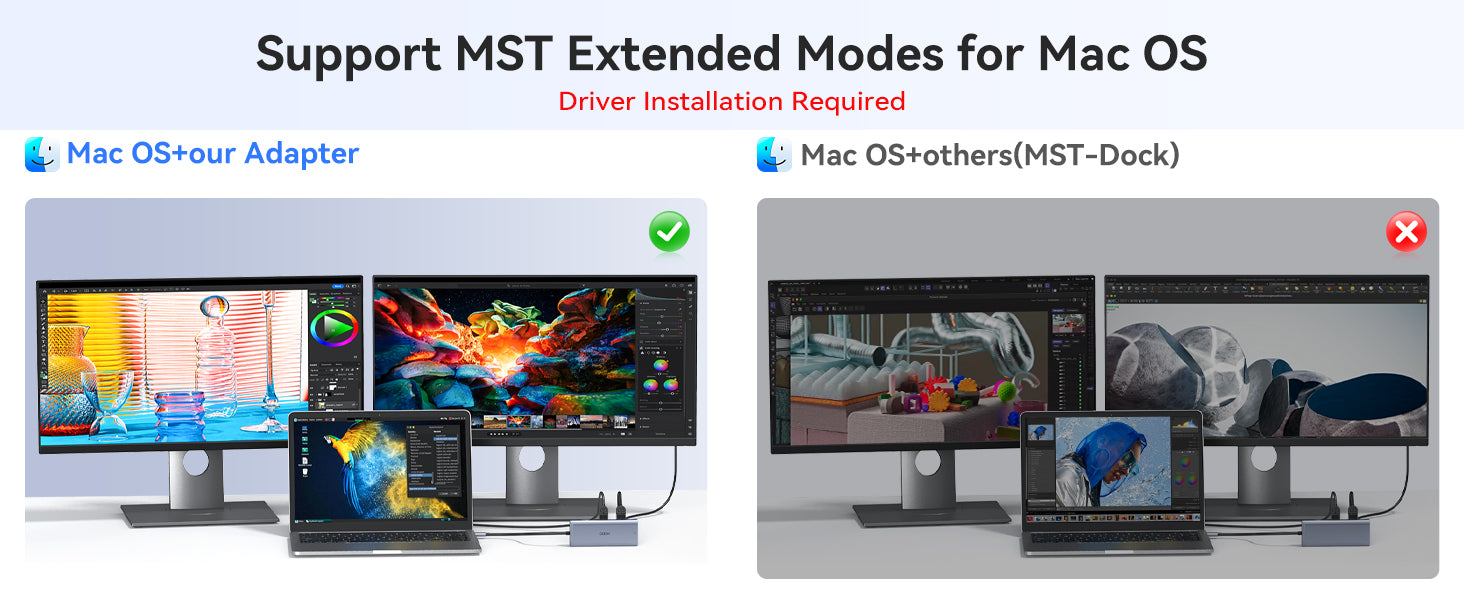 - 【MacBook Docking Station 8 in 1】Entwickelt für MacBook Pro/Air 2018-2020. Ausgestattet mit einem 4K@60Hz HDMI 1, 1080P@60Hz HMDI 2, 2 USB 3.0 und ein USB C Port (bis zu 5 Gbps) ,1*USB 2.0(bis zu 480 Mbps) für Datenübertragung und eine 100W USB C PD, Gigabit Ethernet. Hinweis: Der USB C Hub muss den Treiber installieren. Einfache Installation, verbringen Sie eine Minute