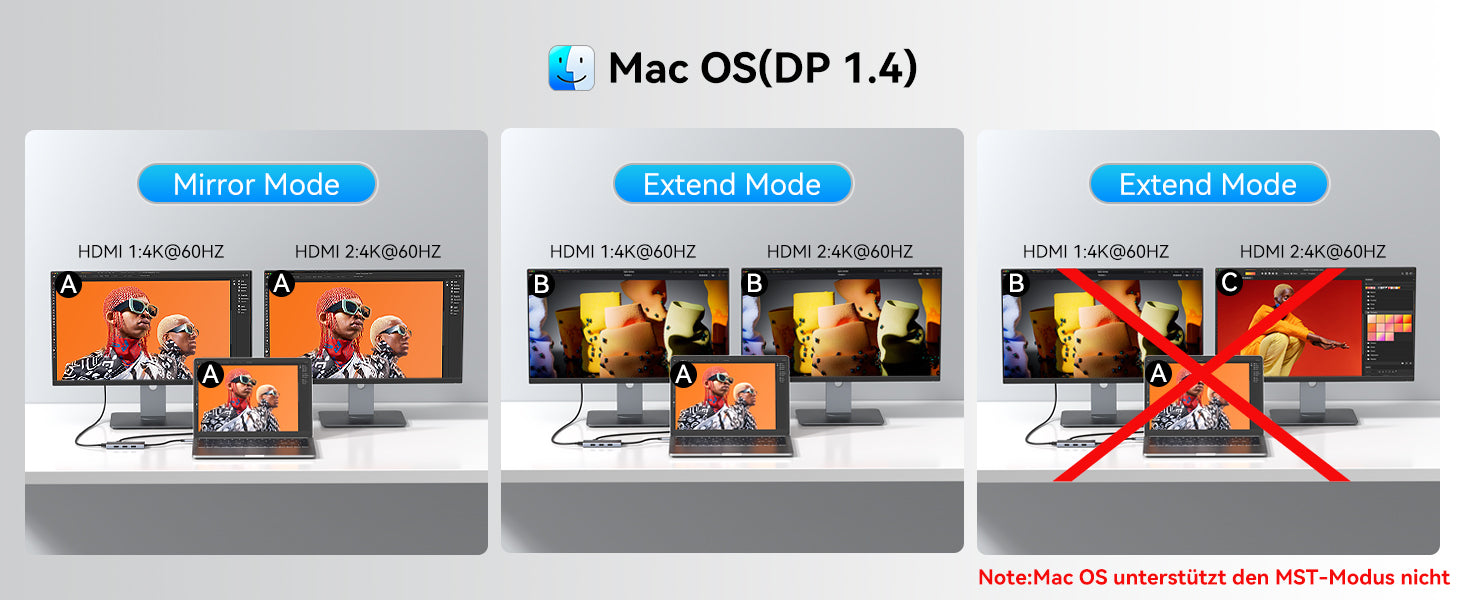 Enjoy Multi-screen Mode and Ultra-high-definition 4K Displays: use dual hdmi simultaneously, two screens can reach 4K@60Hz, expand your Laptop desktop space and create more possibilities. 2 hdmi is used, the resolution can reach up to 4K@60Hz. Please note that if the 2 hdmi is connected to an MacBooks, then it can only be in SST mode, and the 2 hdmi screens will be the same.